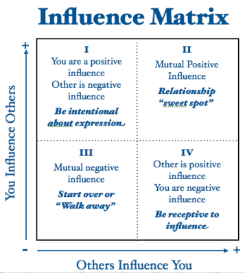 Every relationship can move from quadrant to quadrant at any time; there are no “bright lines” of distinction separating the direction or amount of influence in a relationship. (I wish there were such clear distinctions; relationships in general would be so much more simple!) In fact, that’s why this is an Influence matrix and not a Relationship matrix. The influence of a relationship may endure beyond the life of the relationship itself.